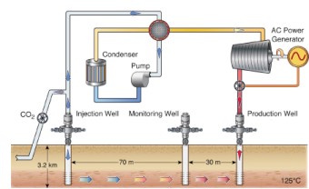 ?? 由美國勞倫斯伯克利國家實驗室科學家領導的一個研究小組,希望成為世界上首個利用二氧化碳通過地熱發電的團隊,他們還希望將二氧化碳永久存儲到地下。這個研究小組早些時候得到美國能源部500萬美元的資助開始設計和測試這項技術。伯克利實驗室地球科學部表示,這是利用地熱加熱二氧化碳來進行發電的首個項目。 研究人員的想法是將二氧化碳注入到地下三公里125℃的沉積層。在這些條件下,二氧化碳成為超臨界狀態,這意味著它同時具有液態和氣態屬性。然后,二氧化碳被抽回地面,推動汽輪機,利用熱力發電。接著,再將二氧化碳注入到地下循環利用。隨著時間的推移,有一部分二氧化碳也會永久封存到地下。更多的二氧化碳會不斷注入到系統中驅動汽輪機轉動。