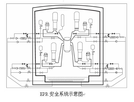 3.AP1000非能動安全殼裂變產(chǎn)物排出系統(tǒng)。AP1000安全殼大氣中活性物質(zhì)的排出完全靠沉淀、擴(kuò)散、熱遷移等自然過程。事故后,如安全殼內(nèi)放射性活度升高,由防火系統(tǒng)提供的非能動安全殼噴淋系統(tǒng)在安全殼外充氮罐的壓力作用下進(jìn)行噴淋,以限制裂變產(chǎn)物的釋放,絕大多數(shù)非氣態(tài)活性物質(zhì)最終沉積在安全殼地坑冷卻水中。 4.安全殼隔離系統(tǒng)。該系統(tǒng)具有兩道屏障,一道在安全殼外,一道在安全殼內(nèi)。與傳統(tǒng)壓水堆核電站相比,AP1000的安全殼機(jī)械貫穿件(包括閘門)數(shù)量大大減少。正常狀態(tài)隔離閥處于關(guān)閉狀態(tài)的比例更高。正常打開的隔離閥也由故障自動關(guān)閉,不要求貫穿件具有支持事故后緩解的功能。 5.非能動主控制室可居留系統(tǒng)。該系統(tǒng)在電廠事故后為主控制室提供新鮮空氣并進(jìn)行冷卻和增壓。在接收到主控制室高輻射信號以后,該系統(tǒng)自動啟動,隔離正常的控制室通風(fēng)通道并開始增壓。系統(tǒng)中的空氣來自一組壓縮空氣貯存箱,可以維持工作人員繼續(xù)居留至少72 小時。 二、EPR安全系統(tǒng)組成和特點(diǎn) EPR主要以法國N4核電站和德國Konvoi核電站為參考,充分吸收了法國和德國多年核電設(shè)計、建造和運(yùn)行經(jīng)驗(yàn),通過漸進(jìn)式的模式改進(jìn)安全系統(tǒng)的設(shè)計,提高核電站的總體安全水平和可利用率。EPR安全水平提高的表現(xiàn):一是安全系統(tǒng)實(shí)現(xiàn)了4重冗余,并提供多種備用功能以便在安全系統(tǒng)的所有冗余(設(shè)備、系統(tǒng))都失效時承擔(dān)起相應(yīng)安全功能;二是在設(shè)計上考慮了嚴(yán)重事故預(yù)防和事故后果的緩解。EPR安全設(shè)施主要包括安全殼系統(tǒng)、應(yīng)急堆芯冷卻系統(tǒng)和應(yīng)急給水系統(tǒng)。 1.安全殼系統(tǒng)。EPR采用雙層安全殼,外層是鋼筋混凝土殼,內(nèi)層是帶鋼襯里的預(yù)應(yīng)力混凝土殼。主要設(shè)計特點(diǎn):① 考慮了嚴(yán)重事故工況,能夠承受燃料組件內(nèi)鋯氧化產(chǎn)生的氫燃燒可能造成的壓力;② 雙層安全殼之間的環(huán)廊保持負(fù)壓,保證沒有有害氣體向環(huán)境直接泄漏,泄漏到環(huán)廊內(nèi)的氣體經(jīng)過過濾處理后再向外排放;③ 滿足生物屏蔽和防內(nèi)部災(zāi)害、外部災(zāi)害的要求,還特別考慮了抗飛機(jī)撞擊的能力。④ 考慮嚴(yán)重事故工況,設(shè)有完善的可燃?xì)怏w控制系統(tǒng),包括非能動的催化復(fù)合器和氫點(diǎn)火器,假定100%燃料包殼與水反應(yīng)。⑤ 設(shè)有專門的底板保護(hù)裝置,發(fā)生嚴(yán)重事故時,堆芯熔融物熔穿壓力容器后被導(dǎo)流到一個面積約170 m2的展開區(qū),安全殼內(nèi)換料水池的水以非能動的方式流到展開區(qū),冷卻熔融物,防止底板熔穿,保持安全殼的完整性。⑥ 在設(shè)計基準(zhǔn)事故時,EPR不需要安全殼熱導(dǎo)出系統(tǒng)(即安全殼噴淋系統(tǒng))。EPR安全殼熱導(dǎo)出系統(tǒng)在設(shè)計上是對付嚴(yán)重事故工況的系統(tǒng),作為最終的緩解措施,在安全級系統(tǒng)失效而導(dǎo)致堆熔的情況下,從安全殼和安全殼內(nèi)的換料水箱導(dǎo)出熱量,限制安全殼的壓力升高。 2.應(yīng)急堆芯冷卻系統(tǒng)。該系統(tǒng)主要指安注系統(tǒng),在設(shè)計上,EPR的安注系統(tǒng)和余熱導(dǎo)出系統(tǒng)(RHRS)是共用的。因此EPR的應(yīng)急堆芯冷卻系統(tǒng)不但執(zhí)行安全功能,還要執(zhí)行正常運(yùn)行的功能。主要設(shè)計特點(diǎn):① EPR安注系統(tǒng)由中壓安注系統(tǒng)、低壓安注系統(tǒng)和安注箱組成,其中,低壓安注系統(tǒng)和余熱導(dǎo)出系統(tǒng)共用同一套系統(tǒng)。安注系統(tǒng)由四個系列組成,每個系列的容量為100%,各對應(yīng)一個環(huán)路,系列之間沒有交叉連接,設(shè)備之間實(shí)體隔離。② EPR換料水箱設(shè)置在安全殼內(nèi),與安全殼地坑合二為一,不但提高了水源的可靠性,而且取消了從直接安注到再循環(huán)安注的切換。概率風(fēng)險分析結(jié)果顯示,該項(xiàng)設(shè)計改進(jìn)降低了堆芯損壞概率。③ 在電站正常運(yùn)行期間,EPR安注系統(tǒng)處于直接安注的備用狀態(tài),管道中充滿安全殼內(nèi)換料水箱的含硼水。接收到安注信號后,安注系統(tǒng)自動啟動,只需啟動安注泵,不需要進(jìn)行任何閥門切換,即可實(shí)現(xiàn)安注功能。④ 在多樣性設(shè)計方面,低壓安注系統(tǒng)的第一系列和第四系列裝備了雙冷卻盤管,可以由空氣冷卻的冷凍水系統(tǒng)提供冷卻。維修冷停堆工況下發(fā)生失去全部冷卻水情況時,低壓安注系統(tǒng)的第一系列和第四系列仍可以工作,為反應(yīng)堆冷卻劑系統(tǒng)提供補(bǔ)水。 3.應(yīng)急給水系統(tǒng)。當(dāng)蒸汽發(fā)生器主給水系統(tǒng)失效時,應(yīng)急給水系統(tǒng)確保向蒸汽發(fā)生器供水,并且與蒸汽發(fā)生器大氣釋放閥(或安全閥)一起作用將堆芯的余熱排出,使電廠恢復(fù)并保持在安全狀態(tài)。EPR的應(yīng)急給水系統(tǒng)包括四個相同系列,分別布置在四個安全廠房內(nèi),每個系列包括一個儲水箱和一臺電動泵。應(yīng)急給水系統(tǒng)的四臺電動泵由四臺應(yīng)急柴油發(fā)電