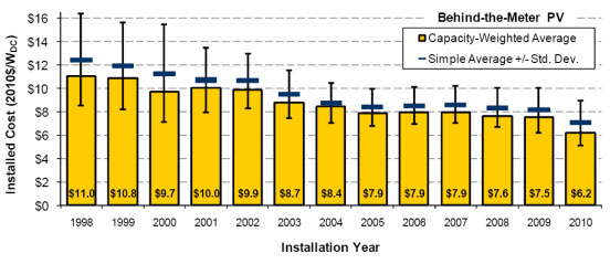 近日,美國能源部勞倫斯伯克利國家實驗室發布《1998-2010年美國光伏系統裝機成本概述》。報告顯示,2010~2011年上半年,美國太陽能光伏發電系統裝機成本大幅降低。 報告考察了1998~2010年間美國42個州安裝的115000個住宅、商用和公共光伏系統,占到全美并網光伏裝機容量的78%。數據顯示,2010年完成的住宅和商用太陽能光伏系統平均裝機成本比2009年下降了17%,2011年上半年又在此基礎上下降了11%。這一趨勢部分是由于光伏組件價格的大幅降低,光伏組件批發價格自2008年以來急劇下降,上游成本削減已傳導到用戶端。