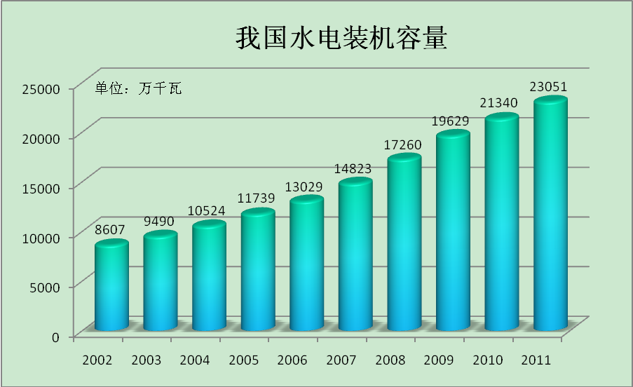 截至2011年,我國水電投產(chǎn)裝機達到2.3億千瓦。