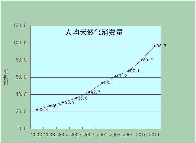 ????我國天然氣消費量從2002年的287.7億立方米迅速增長到2011年的1300億立方米,人均天然氣消費量翻了兩番多。