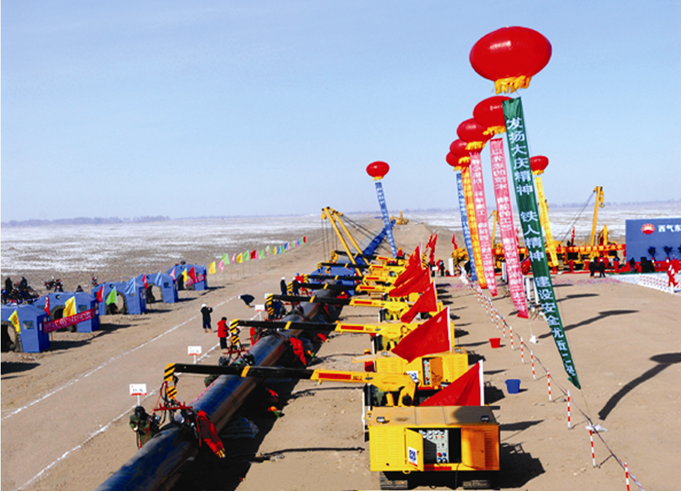 ???西氣東輸一線干線全長3840公里,目前全線輸氣能力達170億立方米/年,向河南、安徽、江蘇、浙江和上海供氣。西氣東輸二線是我國第一條引進境外天然氣資源的特大型管道工程,與中亞天然氣管道A、B線相連接,包括一干和八支干線,全長8704公里,設計輸氣能力300億立方米/年,途經新疆等14個省(區、市)和香港特別行政區,計劃2012年底累計接輸中亞天然氣將超過400億立方米。西氣東輸三線2012年10月開工建設。圖為西氣東輸二線開工。 |