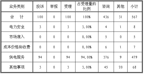 ????為了保護電力投資者、經營者、使用者的合法權益,維護能源市場秩序,依法履行職責,國家能源局積極暢通投訴舉報渠道,切實發揮全國范圍內12398(含12398電話、傳真、電子郵件等)投訴舉報的作用,認真處理人民群眾對違法違規行為的投訴舉報,定期公布能源監管機構對投訴舉報的處理情況。現將2014年春節期間12398投訴舉報處理情況通報如下: ????一、基本情況 ????(一)受理情況 ????2014年春節期間,共收到12398投訴舉報有效信息567件,同比減少14.86%。 ????按訴求性質分類:投訴100件,占有效信息的17.64%,同比減少16件;舉報0件,同比減少2件;咨詢436件,占有效信息的76.90%,同比減少95件;表揚、求助、建議等其他方面31件,占有效信息的5.46%,同比增加12件。 ????(二)辦理情況 ????根據國家有關法律法規規定,對2014年春節期間收到的100件投訴舉報全部進行了受理。截止到2014年2月6日,已辦理完畢75件,占投訴舉報受理量的75.00%。 ????(三)業務分類情況 ????2014年春節期間,能源監管機構收到的567件有效信息中,供電服務479件,成本價格和收費7件,市場準入5件,電力安全8件,其他事項68件。 ????從收到的投訴舉報情況看,供電服務方面的最多,共94件,占投訴舉報的94.00%;其次是電力安全和其他事項方面,各3件,各占投訴舉報的3.00%。(2014年春節期間投訴舉報業務分類情況見表一) 表一 2014年春節期間投訴舉報業務分類情況 ????單位:件