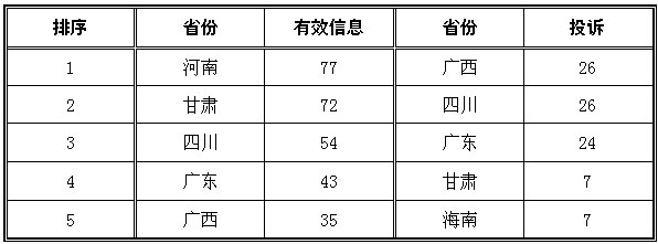 ????(四)區域分布情況 ????2014年春節期間,從能源監管機構收到的12398有效信息來看,河南、甘肅、四川、廣東、廣西排在全國前5位;從投訴數量來看,廣西、四川、廣東、甘肅、海南排在全國前5位;春節期間全國沒有發生舉報事項。(2014年有效信息及投訴數量排名前5位省份情況見表二) 表二 2014年有效信息及投訴數量排名前5位省份情況 ????單位:件