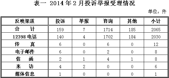 ????為了保護電力投資者、經(jīng)營者、使用者的合法權益,維護能源市場秩序,依法履行監(jiān)管職責,國家能源局積極暢通投訴舉報渠道,切實發(fā)揮全國范圍內(nèi)12398(含12398電話、傳真、電子郵件等)電力投訴舉報熱線的作用,認真受理電力投訴舉報,定期公布能源監(jiān)管機構對電力投訴舉報的處理情況?,F(xiàn)將2014年2月份12398電力投訴舉報處理情況通報如下: ????一、基本情況 ????(一)受理情況 ????2014年2月,共收到12398電力投訴舉報有效信息2065件,環(huán)比下降14.56%。 ????按訴求性質分類:投訴159件,占有效信息的7.70%,環(huán)比減少18件;舉報7件,占有效信息的0.34%,環(huán)比減少4件;咨詢1714件,占有效信息的83.00 %,環(huán)比減少321件;表揚、求助、建議等其他方面185件,占有效信息的9.09%,環(huán)比減少9件。 ????按反映渠道分類:12398電話2030件,傳真12件,電子郵件8件,信函8件,來訪6件,媒體信息1件。(2014年2月投訴舉報受理情況見表一)