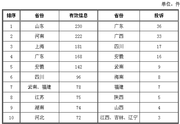 ????(四)區(qū)域分布情況 ????2014年1月,從能源監(jiān)管機構收到的12398電力投訴舉報有效信息來看,山東、河南、上海、廣東、安徽排在全國前5位;從投訴數(shù)量來看,廣東、廣西、四川、安徽、云南排在全國前5位。(2014年2月有效信息及投訴排名前10位省份情況見表三) ?表三 2014年2月有效信息與投訴排名前10位省份情況