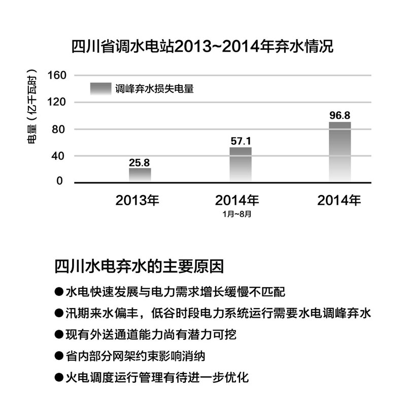 國家能源局發布的《水電基地棄水問題駐點四川監管報告》顯示 五大主因致四川水電棄水 2014年調峰棄水電量96.8億千瓦時 ????我國水電發電量去年歷史性突破1萬億千瓦時,為能源供給增添了一抹綠色。然而,欣喜之余,我們難以隱忍棄水之殤。 ????國家能源局日前發布的《水電基地棄水問題駐點四川監管報告》(以下簡稱《報告》)披露,2014年四川調峰棄水電量達96.8億千瓦時,占豐水期水電發電量的14.93%。 ????《報告》根據工作組駐點四川監管情況,深入分析了導致水電棄水的5大主因,并就突出問題提出了監管建議。 ????(一)水電快速發展、電力需求增長緩慢,四川水電棄水壓力山大 ????近兩年,伴隨著我國加快轉變電力發展方式,著力推進電力結構優化和產業升級,四川水電呈現集中投產態勢,與之相對應的水電消納和棄水相伴相生。 ????一方面,水電集中投產。“十二五”期間,四川每年有1000萬千瓦以上水電裝機增長,至2014年9月底,其水電裝機達6028萬千瓦,占全省總裝機比例由2013年的76.74%上升到79.4%。 ????另一方面,省內、省外消納市場持續低迷。四川省內售電量增速已由“十二五”初的16.4%下降到3.4%。而華中、華東區域電力供需寬松,外購電意愿不強。 ????《報告》指出,盡管四川省政府及各電力企業積極作為,給政策、強電網,力促水電消納,但四川水電棄水情況依然存在。 ????據核查統計,2014年1-8月四川省調(不含國調廠)水電站共產生調峰棄水損失電量57.1億千瓦時(含調峰、檢修等正常棄水),較2013年有所增長(如圖所示)。