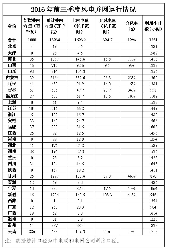 2016年前三季度風電并網運行情況