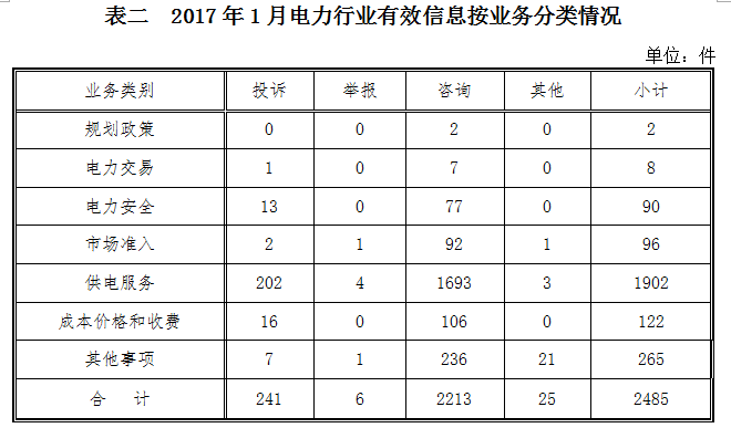 ????(二)分類情況 ????1月收到的有效信息中,電力行業類2485件,占86.43%;新能源和可再生能源行業類79件,占2.75%;石油天然氣行業類35件,占1.22%;煤炭行業類2件,占0.07%;其他事項274件,占9.53%。 ????投訴舉報主要集中在電力行業,共247件。從業務分類情況看,供電服務方面206件,占83.40%;電力安全方面13件,占5.26%;成本價格和收費16件,占6.48%;市場準入方面3件,占1.21%;電力交易方面1件,占0.41%;其他事項8件,占3.24%。(2017年1月電力行業有效信息按業務分類情況見表二)