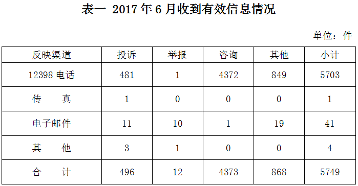 ????為了保護能源投資者、經營者、使用者的合法權益,維護能源市場秩序,依法履行監管職責,國家能源局積極暢通投訴舉報渠道,切實發揮12398能源監管熱線(含12398電話、傳真、電子郵件等)的作用,認真受理能源監管投訴舉報事項,定期公布投訴舉報處理情況。現將2017年6月12398能源監管熱線(以下簡稱12398熱線)投訴舉報處理情況通報如下: ????一、基本情況 ????(一)收到有效信息情況 ????2017年6月,國家能源局12398熱線共收到有效信息5749件,環比增加3.08%。 ????按訴求性質分類,投訴496件,占有效信息的8.63%;舉報12件,占有效信息的0.21%;咨詢4373件,占有效信息的76.07%;表揚、求助、建議等其他方面868件,占有效信息的15.10%。 ????按反映渠道分類,12398電話5703件,傳真1件,電子郵件41件,其他4件。(2017年6月收到有效信息情況見表一)