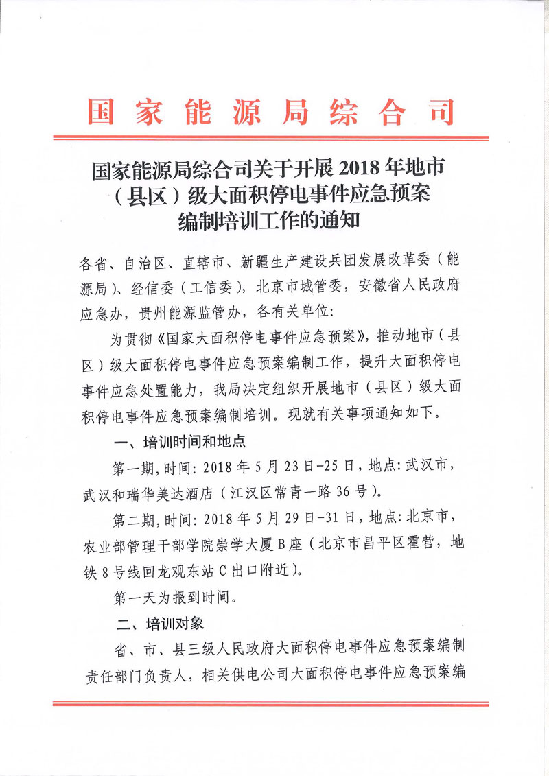 國(guó)家能源局綜合司關(guān)于開(kāi)展2018年地市(縣區(qū))級(jí)大面積停電事件應(yīng)急預(yù)案編制培訓(xùn)工作的通知