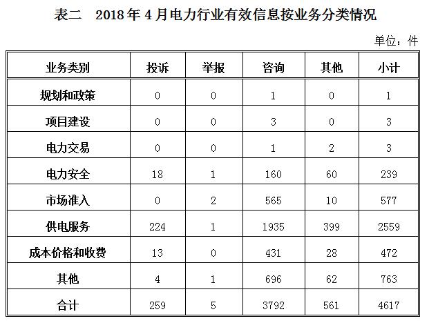 ????二、分類情況 ????2018年4月收到的有效信息中,電力行業類4617件,占69.15%;新能源和可再生能源行業類1302件,占19.50%;石油天然氣行業類153件,占2.29%;煤炭行業類3件,占0.04%;其他事項602件,占9.02%。 ????投訴舉報主要集中在電力行業,共264件。從業務分類情況看,電力安全方面19件,占7.20%;市場準入方面2件,占0.76%;供電服務方面225件,占85.23%;成本價格和收費方面13件,占4.92%;其他方面5件,占1.89%。(2018年4月電力行業有效信息按業務分類情況見表二)
