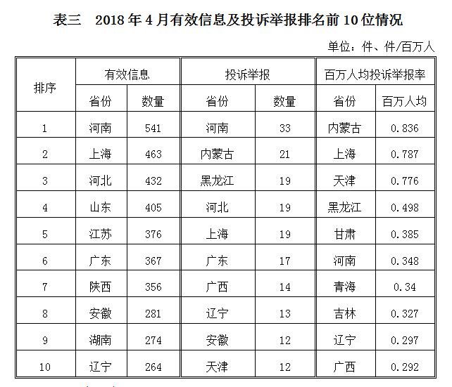????三、分布情況 ????2018年4月,各省(自治區、直轄市)按照有效信息數量排序,河南、上海、河北等省(市)列全國前10位;按照投訴舉報數量排序,河南、內蒙古、黑龍江等省(自治區)排在全國前10位;按照百萬人均投訴舉報率排序,內蒙古、上海、天津等省(市、自治區)位于全國前10位。(2018年4月有效信息及投訴舉報排名前10位情況見表三)