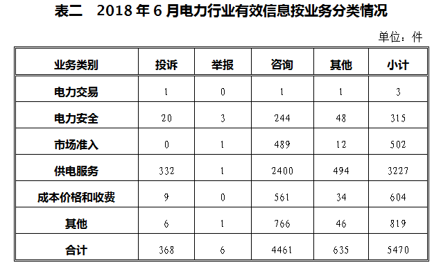 ????二、分類情況 ????2018年6月收到的有效信息中,電力行業(yè)類5470件,占63.33%;新能源和可再生能源行業(yè)類2400件,占27.79%;石油天然氣行業(yè)類158件,占1.83%;煤炭行業(yè)類7件,占0.08%;其他事項(xiàng)602件,占6.97%。收到的投訴舉報(bào)中,電力行業(yè)類374件,占89.90%,新能源和可再生能源行業(yè)類共41件,占9.86%,其他領(lǐng)域1件,占0.24%。電力行業(yè)的投訴舉報(bào)中,供電服務(wù)方面333件,占89.04%;電力安全方面23件,占6.15%;成本價(jià)格和收費(fèi)方面9件,占2.40%;電力交易、市場準(zhǔn)入方面各1件,占0.27%;其他方面7件,占1.87%。(2018年6月電力行業(yè)有效信息按業(yè)務(wù)分類情況見表二)。