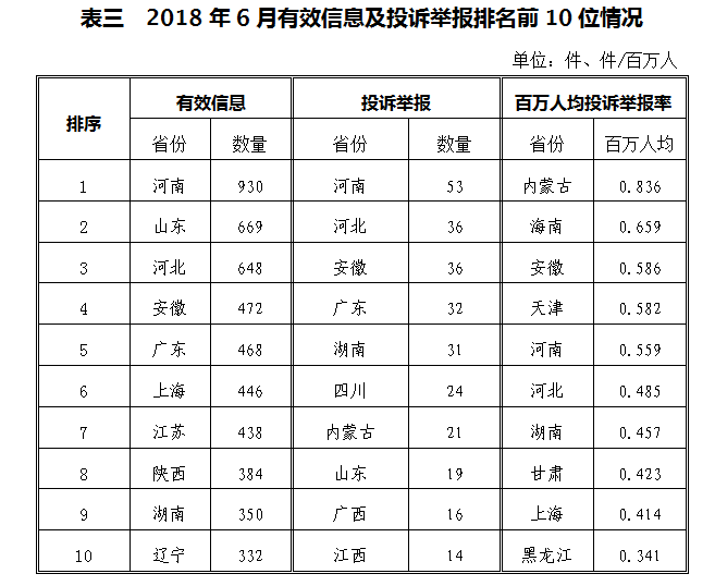 ????三、分布情況 ????2018年6月,各省(自治區(qū)、直轄市)按照收到的有效信息數(shù)量排序,河南、山東、河北、安徽、廣東等列全國前10位;按照投訴舉報(bào)數(shù)量排序,河南、河北、安徽、廣東、湖南等排在全國前10位。按照百萬人均投訴舉報(bào)數(shù)量排序,內(nèi)蒙古、海南、安徽、天津、河南等排在全國前10位。(2018年6月有效信息及投訴舉報(bào)排名前10位情況見表三)
