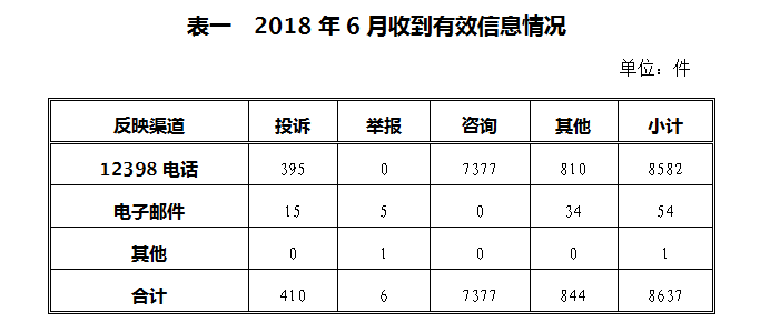 ????一、基本情況 ????2018年6月,國家能源局12398能源監(jiān)管熱線(以下簡稱12398熱線)共收到有效信息8637件,環(huán)比增加8.87%。 ????按訴求性質(zhì)分類,投訴410件,占有效信息的4.75%;舉報(bào)6件,占有效信息的0.07%;咨詢7377件,占有效信息的85.41%;表揚(yáng)、求助、建議等其他方面844件,占有效信息的9.77%。 ????按反映渠道分類,12398電話8582件,電子郵件54件,其他1件。(2018年6月收到有效信息情況見表一)