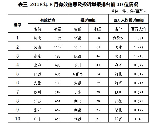 ????三、分布情況 ????各省(自治區、直轄市)按照收到的有效信息數量排序,河北、河南、山東、上海、陜西等列全國前10位;按照投訴舉報數量排序,河南、河北、陜西、四川、內蒙古等排在全國前10位。按照百萬人均投訴舉報數量排序,內蒙古、天津、陜西、海南、河北等排在全國前10位。(2018年8月有效信息及投訴舉報排名前10位情況見表三)