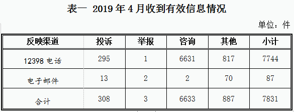 ????一、基本情況 ????2019年4月,國家能源局12398熱線共收到有效信息7831件,環(huán)比增加11.20%,同比增加17.28%。其中,投訴308件,占有效信息的3.93%;舉報3件,占有效信息的0.04%;咨詢6633件,占有效信息的84.70%;表揚、求助、建議等其他方面887件,占有效信息的11.33%。 ????在有效信息中,通過12398電話反映的7744件,通過電子郵件反映的87件。(2019年4月收到有效信息情況見表一)