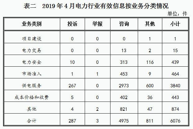????二、分類情況 ????按行業(yè)分類2019年4月收到的有效信息中: ????電力行業(yè)排在首位,有效信息數量為6076件,占全部有效信息的77.59%;其中受理的投訴舉報數量為290件,占全部投訴舉報數量的93.25%。群眾反映的問題主要集中在供電服務、電力安全、成本價格和收費等方面。 ????新能源和可再生能源行業(yè)排在第二位,有效信息數量為624件,占全部有效信息的7.97%;其中受理的投訴舉報數量為21件,占全部投訴舉報數量的6.75%。群眾反映的問題主要集中在分布式光伏發(fā)電項目上網電費結算、發(fā)電量補貼轉付等方面。 ????石油天然氣行業(yè)排在第三位,有效信息數量為337件,占4.3%。有效信息主要集中于咨詢項目備案、燃氣管道改造、燃氣安裝等問題。 ????其他有效信息合計794件,占10.14%,其中涉及煤炭行業(yè)的主要以咨詢有關項目審批等問題為主。
