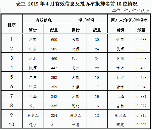???? ????三、分布情況 ????各?。ㄗ灾螀^(qū)、直轄市)按照收到的有效信息數量排序,河南、山東、河北、陜西、廣東等列全國前10位;按照投訴舉報數量排序,云南、陜西、四川、貴州、湖南等排在全國前10位。按照百萬人均投訴舉報數量排序,云南、陜西、貴州、海南、甘肅、青海等排在全國前10位。(2019年4月有效信息及投訴舉報排名前10位情況見表三)