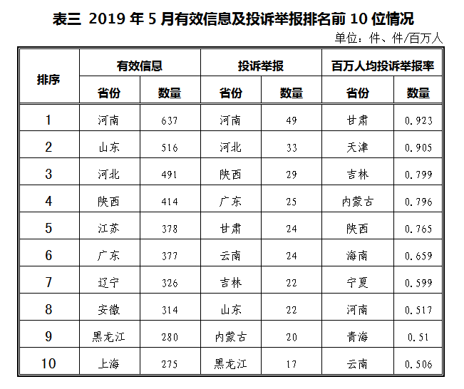 ????三、分布情況 ????各省(自治區、直轄市)按照收到的有效信息數量排序,河南、山東、河北、陜西、江蘇等列全國前10位;按照投訴舉報數量排序,河南、河北、陜西、廣東、甘肅等排在全國前10位。按照百萬人均投訴舉報數量排序,甘肅、天津、吉林、內蒙古、陜西等排在全國前10位。(2019年5月有效信息及投訴舉報排名前10位情況見表三)