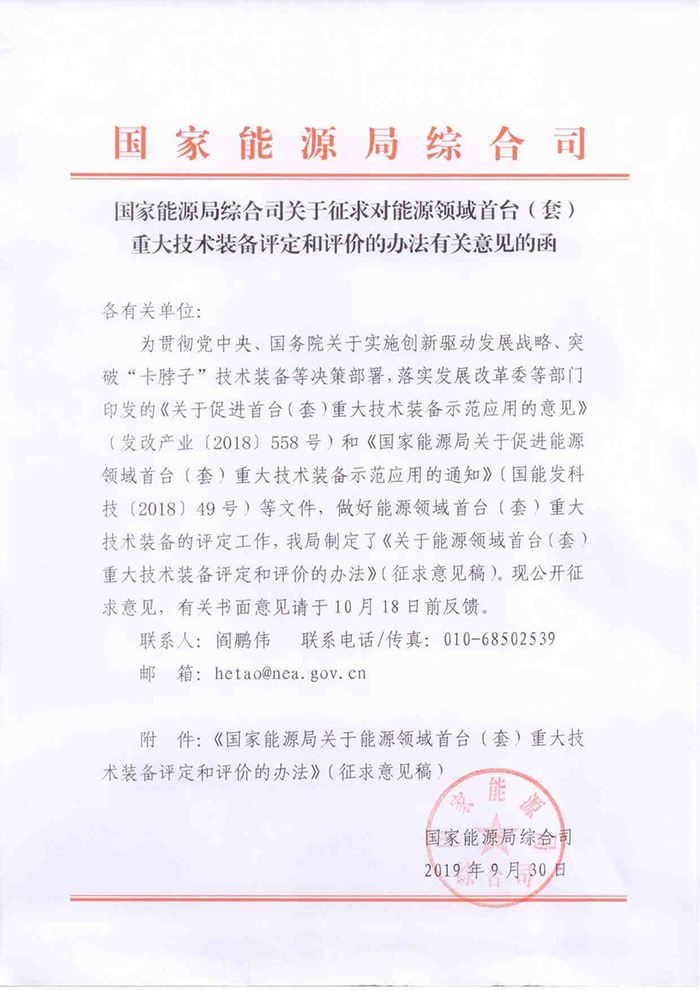 國家能源局綜合司關于征求對能源領域首臺(套)重大技術裝備評定和評價的辦法有關意見的函