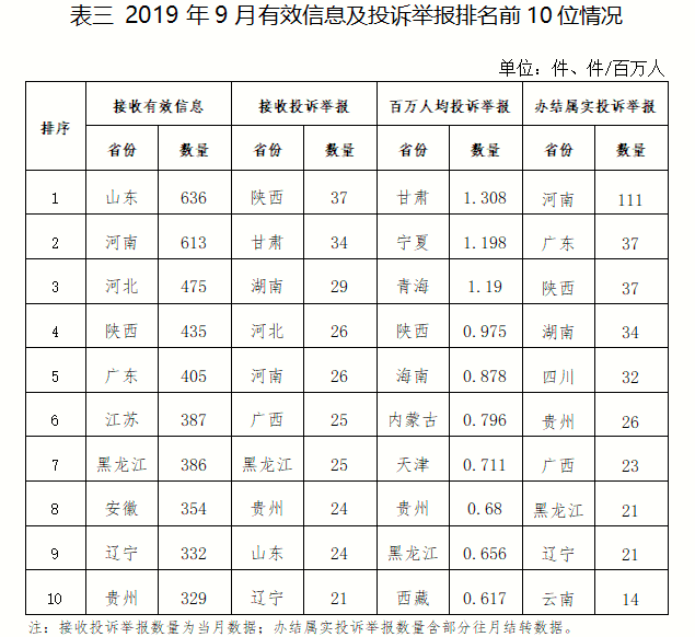 三、分布情況 各省(自治區、直轄市)按照收到的有效信息數量排序,山東、河南、河北、陜西、廣東等排在全國前10位;按照投訴舉報數量排序,陜西、甘肅、湖南、河北、河南等排在全國前10位。按照百萬人均投訴舉報數量排序,甘肅,寧夏,青海,陜西,海南等排在全國前10位。按照辦結屬實投訴舉報數量排序,河南、廣東、陜西、湖南、四川等排在全國前10位。(2019年9月有效信息及投訴舉報排名前10位情況見表三)