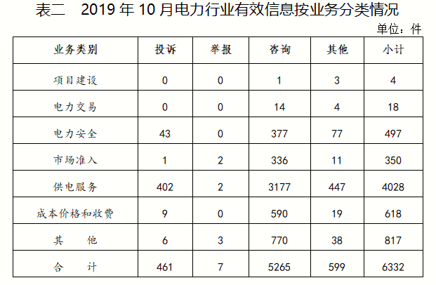 二、分類情況 按行業(yè)分類2019年10月收到的有效信息中: 電力行業(yè)排在首位,有效信息數(shù)量為6332件,占全部有效信息的78.64%;其中受理的投訴舉報數(shù)量為449件,占全部投訴舉報數(shù)量的92%。群眾反映的問題主要集中在供電服務、電力安全、成本價格和收費等方面。(2019年10月電力行業(yè)有效信息按業(yè)務分類情況見表二) 新能源和可再生能源行業(yè)排在第二位,有效信息數(shù)量為653件,占全部有效信息的8.11%;其中受理的投訴舉報數(shù)量為20件,占全部投訴舉報數(shù)量的4.09%。群眾反映的問題主要集中在分布式光伏發(fā)電項目并網(wǎng)驗收、補貼費用結算等方面。 石油天然氣行業(yè)排在第三位,有效信息數(shù)量為428件,占全部有效信息的5.32%。有效信息主要集中于咨詢天然氣管道安裝和收費、加油站消費的發(fā)票開具情況,反映天然氣設施故障、供氣中斷等方面。 其他有效信息合計639件,占全部有效信息的7.93%,其中涉及煤炭行業(yè)的主要以咨詢煤炭行業(yè)標準,反映煤炭污染環(huán)境、未經(jīng)許可開采煤礦等方面。