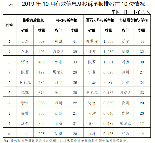 三、分布情況 各省(自治區(qū)、直轄市)按照收到的有效信息數(shù)量排序,山東、河北、河南、陜西、黑龍江等列全國前10位;按照投訴舉報數(shù)量排序,陜西、內蒙古、甘肅、黑龍江、河北等排在全國前10位;按照百萬人均投訴舉報數(shù)量排序,內蒙古、甘肅、陜西、寧夏、上海等排在全國前10位;按照辦結屬實投訴舉報數(shù)量排序,遼寧、湖南、河南、四川、甘肅等排在全國前10位。(2019年10月有效信息及投訴舉報排名前10位情況見表三)