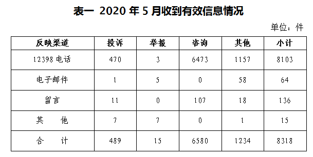 一、基本情況 2020年5月,國(guó)家能源局12398熱線(xiàn)共收到有效信息8318件,環(huán)比減少5.72%,同比增加12.09%。 按訴求性質(zhì)分類(lèi),投訴489件,占有效信息的5.88%;舉報(bào)15件,占有效信息的0.18%;咨詢(xún)6580件,占有效信息的79.11%;表?yè)P(yáng)、求助、建議等其他方面1234件,占有效信息的14.84%。 按反映渠道分類(lèi),12398電話(huà)8103件,電子郵件64件,留言136件,其他15件。(2020年5月收到有效信息情況見(jiàn)表一)