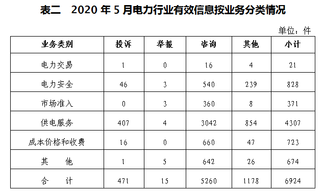 二、分類(lèi)情況 2020年5月收到的有效信息中: 電力行業(yè)排在首位,有效信息數(shù)量為6924件,占全部有效信息的83.24%;其中受理的投訴舉報(bào)數(shù)量418件,占全部投訴舉報(bào)數(shù)量的82.94%。群眾反映問(wèn)題主要集中在供電服務(wù)、電力安全、成本價(jià)格和收費(fèi)等方面。(2020年5月電力行業(yè)有效信息按業(yè)務(wù)分類(lèi)情況見(jiàn)表二) 新能源和可再生能源行業(yè)排在第二位,有效信息數(shù)量為470件,占全部有效信息的5.65%;其中受理的投訴舉報(bào)數(shù)量為11件,占全部投訴舉報(bào)數(shù)量的2.18%。群眾反映的問(wèn)題主要集中在分布式光伏發(fā)電項(xiàng)目并網(wǎng)驗(yàn)收、上網(wǎng)電費(fèi)和補(bǔ)貼結(jié)算等方面。 石油天然氣行業(yè)排在第三位,有效信息數(shù)量為179件,占全部有效信息的2.15%。有效信息主要集中于咨詢(xún)居民燃?xì)獍惭b及收費(fèi)、反映燃?xì)夤收蠁?wèn)題等方面。 其他有效信息合計(jì)745件,占全部有效信息的8.96%。其中涉及煤炭行業(yè)的主要內(nèi)容是咨詢(xún)煤炭相關(guān)產(chǎn)業(yè)政策、查詢(xún)煤礦項(xiàng)目信息等方面。