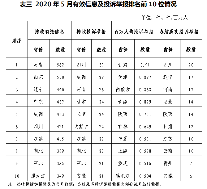 三、分布情況 各省(自治區(qū)、直轄市)按照收到的有效信息數(shù)量排序,河南、山東、遼寧、廣東、陜西、四川、江蘇、湖北、河北、黑龍江等列全國(guó)前10位;按照投訴舉報(bào)數(shù)量排序,四川、陜西、河南、甘肅、云南、內(nèi)蒙古、江蘇、湖北、河北、安徽等排在全國(guó)前10位;按照百萬(wàn)人均投訴舉報(bào)數(shù)量排序,甘肅、天津、內(nèi)蒙古、青海、陜西、吉林、寧夏、上海、重慶、黑龍江等排在全國(guó)前10位;按照辦結(jié)屬實(shí)投訴舉報(bào)數(shù)量排序,四川、河南、遼寧、湖北、陜西、甘肅、江蘇、云南、貴州、安徽等排在全國(guó)前10位。(2020年5月有效信息及投訴舉報(bào)排名前10位情況見(jiàn)表三)