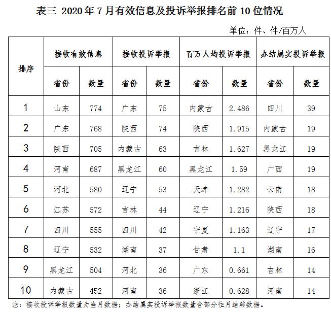 三、分布情況 各省(自治區(qū)、直轄市)按照收到的有效信息數(shù)量排序,山東、廣東、陜西、河南、河北、江蘇 、四川 、遼寧 、黑龍江 、內(nèi)蒙古等列全國前10位;按照投訴舉報數(shù)量排序,廣東、陜西、內(nèi)蒙古、黑龍江、遼寧、吉林、四川、湖南、河北、河南等排在全國前10位;按照百萬人均投訴舉報數(shù)量排序,內(nèi)蒙古、陜西、吉林、黑龍江、天津市、遼寧、寧夏、甘肅、廣東、浙江等排在全國前10位;按照辦結(jié)屬實投訴舉報數(shù)量排序,四川、內(nèi)蒙古、黑龍江、廣西、云南、陜西、遼寧、湖南、吉林、河南等排在全國前10位。(2020年7月有效信息及投訴舉報排名前10位情況見表三)