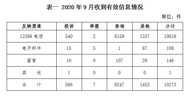 一、基本情況 2020年9月,國家能源局12398熱線共收到有效信息10273件,環比減少9.93%,同比增加22.62%。 按訴求性質分類,投訴566件、占有效信息的5.51%,舉報7件、占有效信息的0.07%,咨詢8247件、占有效信息的80.28%,表揚、求助、建議等其他方面1453件,占有效信息的14.14%。 按反映渠道分類,12398電話10018件,電子郵件108件,留言146件,其他1件。(2020年9月收到有效信息情況見表一)