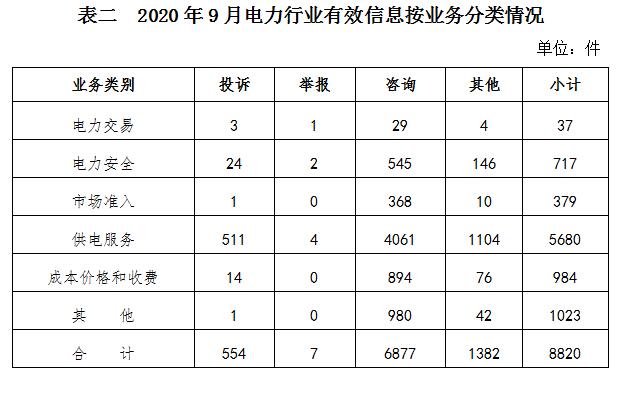 二、分類情況 2020年9月收到的有效信息中: 電力行業排在首位,有效信息數量為8820件、占全部有效信息的85.86%,其中受理的投訴舉報數量525件,占全部投訴舉報數量的91.62%。群眾反映問題主要集中在供電服務、成本價格及收費等方面。(2020年9月電力行業有效信息按業務分類情況見表二) 新能源和可再生能源行業排在第二位,有效信息數量為468件、占全部有效信息的4.56%,其中受理的投訴舉報數量為12件,占全部投訴舉報數量的2.09%。群眾反映的問題主要集中在分布式光伏發電項目上網電費和補貼結算等方面。 石油天然氣行業排在第三位,有效信息數量為332件,占全部有效信息的3.23%。群眾咨詢的問題主要集中在居民燃氣安裝及收費等方面。 其他有效信息合計653件、占全部有效信息的6.36%。其中涉及煤炭行業的主要內容是咨詢煤炭相關產業政策等方面。
