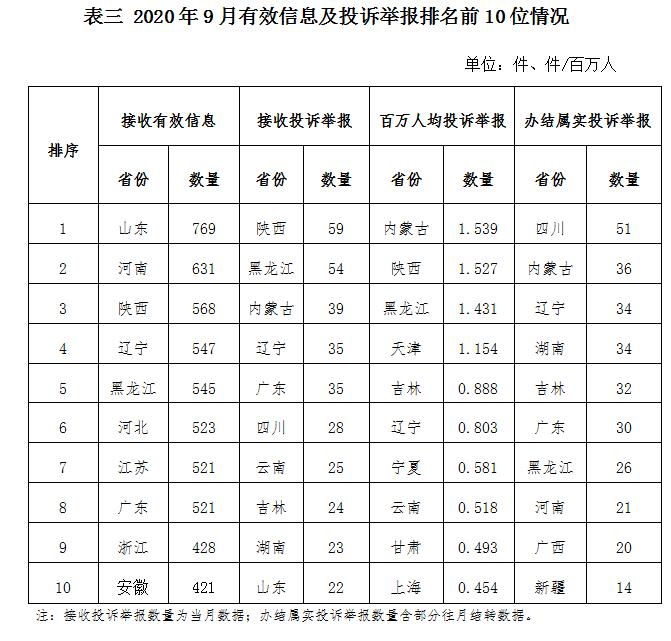 三、分布情況 各?。ㄗ灾螀^、直轄市)按照收到的有效信息數量排序,山東、河南、陜西、遼寧、黑龍江、河北、江蘇、廣東、浙江、安徽等列全國前10位;按照投訴舉報數量排序,陜西、黑龍江、內蒙古、遼寧、廣東、四川、云南、吉林、湖南、山東等排在全國前10位;按照百萬人均投訴舉報數量排序,內蒙古、陜西、黑龍江、天津、吉林、遼寧、寧夏、云南、甘肅、上海等排在全國前10位; 按照辦結屬實投訴舉報數量排序,四川、內蒙古、遼寧、湖南、吉林、廣東、黑龍江、河南、廣西、新疆等排在全國前10位。(2020年9月有效信息及投訴舉報排名前10位情況見表三)