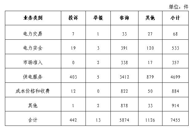 按訴求性質分類,投訴451件,占有效信息的4.71%;舉報14件,占有效信息的0.15%;咨詢7925件,占有效信息的82.68%;表揚、求助、建議等其他方面1195件,占有效信息的12.47%。 按反映渠道分類,12398電話9318件,電子郵件108件,留言157件,其他2件。 二、分類情況 2020年11月收到的有效信息中: 電力行業排在首位,有效信息數量為7455件,占全部有效信息的77.78%,群眾關注的內容主要集中于停電信息、電費收取、煤改電等方面。(2020年11月電力行業有效信息按業務分類情況見表二) 表二 2020年11月電力行業有效信息按業務分類情況