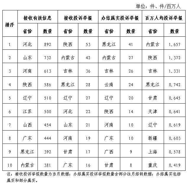 石油天然氣行業排在第二位,有效信息數量為855件,占全部有效信息的8.92%。群眾關注的內容主要集中于居民燃氣安裝及收費、煤改氣等方面。 新能源和可再生能源行業排在第三位,有效信息數量為466件,占全部有效信息的4.86%。群眾關注的內容主要集中于分布式光伏發電項目申請流程、備案及補貼結算等方面。 其他有效信息合計809件,占全部有效信息的8.44%。其中群眾對于煤炭行業關注的內容主要集中于煤礦項目信息、煤炭相關產業政策、煤改電補貼發放等方面。 三、分布情況 各省(自治區、直轄市)按照收到的有效信息數量排序,河北、山東、河南、陜西、遼寧、江蘇、山西、廣東、黑龍江、內蒙古等列全國前10位;按照投訴舉報數量排序,陜西、內蒙古、吉林、黑龍江、遼寧、河北、山東、河南、甘肅、廣東等排在全國前10位;按照百萬人均投訴舉報數量排序,內蒙古、陜西、吉林、黑龍江、甘肅、天津、遼寧、新疆、上海、重慶等排在全國前10位;按照辦結屬實投訴舉報數量排序,黑龍江、內蒙古、吉林、云南、遼寧、陜西、河南、廣東、廣西、甘肅等排在全國前10位。(2020年11月有效信息及投訴舉報排名前10位情況見表三) 表三 2020年11月有效信息及投訴舉報排名前10位情況
