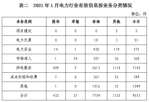 按訴求性質分類,投訴438件,占有效信息的3.40%;舉報28件,占有效信息的0.22%;咨詢11049件,占有效信息的85.64%;表揚、求助、建議等其他方面1386件,占有效信息的10.74%。 按反映渠道分類,12398電話12643件,電子郵件132件,留言124件,其他2件。 二、分類情況 2021年1月收到的有效信息中: 電力行業排在首位,有效信息數量為9553件,占全部有效信息的74.05%,群眾關注的內容主要集中于停電信息、電費收取等方面。(2021年1月電力行業有效信息按業務分類情況見表二)