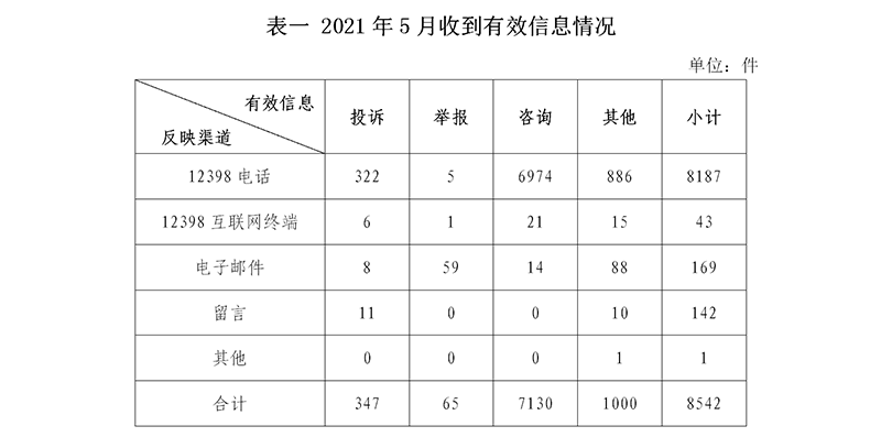 一、基本情況 2021年5月,國家能源局12398能源監(jiān)管熱線(以下簡稱12398熱線)共收到有效信息8542件(包含投訴、舉報(bào)、咨詢和其他訴求類別),環(huán)比減少1.78%,同比增加2.69%。(2021年5月收到有效信息情況見表一)