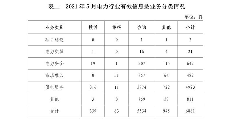 按訴求性質(zhì)分類,投訴347件,占有效信息的4.06%;舉報(bào)65件,占有效信息的0.76%;咨詢7130件,占有效信息的83.47%;表揚(yáng)、求助、建議等其他方面1000件,占有效信息的11.71%。 按反映渠道分類,12398電話8187件,12398互聯(lián)網(wǎng)終端43件,電子郵件169件,留言142件,其他1件。 二、分類情況 2021年5月收到的有效信息中: 電力行業(yè)排在首位,有效信息數(shù)量為6881件,占全部有效信息的80.55%,群眾關(guān)注的內(nèi)容主要集中于故障停電、電費(fèi)交納、電表計(jì)量等方面。(2021年5月電力行業(yè)有效信息按業(yè)務(wù)分類情況見表二)