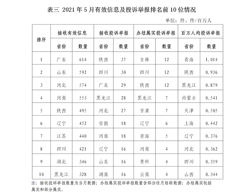 石油天然氣行業(yè)排在第二位,有效信息數(shù)量為518件,占全部有效信息的6.06%。群眾關(guān)注的內(nèi)容主要集中于居民燃?xì)庠O(shè)備故障、居民燃?xì)鈭?bào)裝等方面。 新能源和可再生能源行業(yè)排在第三位,有效信息數(shù)量為505件,占全部有效信息的5.91%。群眾關(guān)注的內(nèi)容主要集中于居民分布式光伏發(fā)電項(xiàng)目并網(wǎng)、電費(fèi)結(jié)算等方面。 其他有效信息合計(jì)638件,占全部有效信息的7.47%。其中群眾對(duì)于煤炭行業(yè)關(guān)注的內(nèi)容主要集中于煤炭行業(yè)政策咨詢等方面。 三、分布情況 各省(自治區(qū)、直轄市)按照收到的有效信息數(shù)量排序,廣東、山東、河北、河南、陜西、遼寧、江蘇、四川、湖北、黑龍江等列全國前10位;按照投訴舉報(bào)數(shù)量排序,陜西、四川、廣東、黑龍江、河北、安徽、河南、遼寧、山東、湖南等排在全國前10位;按照辦結(jié)屬實(shí)投訴舉報(bào)數(shù)量排序,吉林、四川、陜西、黑龍江、甘肅、遼寧、青海、河南、貴州、云南等排在全國前10位;按照百萬人均投訴舉報(bào)數(shù)量排序,青海、陜西、黑龍江、內(nèi)蒙古、天津、上海、遼寧、河北、四川、山西等排在全國前10位。(2021年5月有效信息及投訴舉報(bào)排名前10位情況見表三)