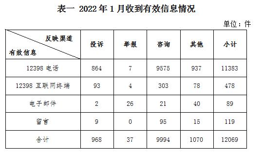 一、基本情況 2022年1月,國家能源局12398能源監管熱線(以下簡稱12398熱線)共收到有效信息12069件(包含投訴、舉報、咨詢和其他訴求類別),環比減少10.77%,同比減少6.45%。(2022年1月收到有效信息情況見表一)