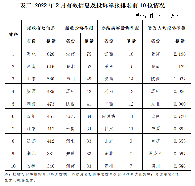 石油天然氣行業排在第二位,有效信息數量為1563件,占全部有效信息的18.68%。群眾關注的內容主要集中在咨詢居民燃氣安裝及收費、反映燃氣故障問題等方面。 新能源和可再生能源行業排在第三位,有效信息數量為401件,占全部有效信息的4.79%。群眾關注的內容主要集中在居民分布式光伏發電項目并網、電費結算等方面。 其他有效信息合計861件,占全部有效信息的10.29%。其中涉及煤炭行業的主要集中在煤炭行業政策、煤礦項目信息等方面。 三、分布情況 各省(自治區、直轄市)按照接收的有效信息數量排序,河北、河南、山東、陜西、湖南、四川、遼寧、江蘇、湖北、安徽排在全國前10位;按照接收的投訴舉報數量排序,湖南、湖北、四川、遼寧、陜西、山東、云南、河北、安徽、河南排在全國前10位;按照辦結屬實的投訴舉報數量排序,江西、重慶、陜西、河南、廣西、內蒙古、甘肅、山東、湖北、貴州排在全國前10位;按照百萬人均投訴舉報數量排序,青海、湖南、陜西、遼寧、湖北、云南、寧夏、重慶、黑龍江、四川排在全國前10位。(2022年2月有效信息及投訴舉報排名前10位情況見表三)