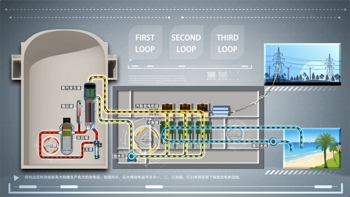 核能也稱原子能,是原子核結構發生變化時釋放出來的巨大能量,包括裂變能和聚變能兩種主要形式。目前核能發電利用的是裂變能。以壓水堆核電站為例,核燃料在反應堆中通過核裂變產生的熱量加熱一回路高壓水,一回路水通過蒸汽發生器加熱二回路水使之變為蒸汽。蒸汽通過管路進入汽輪機,推動汽輪發電機發電,發出的電通過電網送至千家萬戶。整個過程的能量轉換是由核能轉換為熱能,熱能轉換為機械能,機械能再轉換為電能。核電站可分為兩部分,一是核島,包括反應堆廠房、輔助廠房、核燃料廠房和應急柴油機廠房。二是常規島,包括汽輪發電機廠房和海水泵房。我國目前核電站采用的堆型有壓水堆、重水堆、高溫氣冷堆和快中子堆。