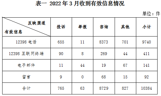 一、基本情況 2022年3月,國家能源局12398能源監管熱線(以下簡稱12398熱線)共收到有效信息10384件(包含投訴、舉報、咨詢和其他訴求類別),環比增加24.12%,同比增加23.14%。(2022年3月收到有效信息情況見表一)