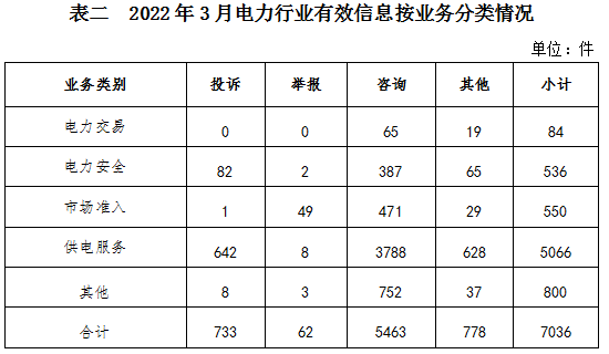 按訴求性質分類,投訴765件,占有效信息的7.37%;舉報63件,占有效信息的0.61%;咨詢8729件,占有效信息的84.06%;表揚、求助、建議等其他方面827件,占有效信息的7.96%。 按反映渠道分類,12398電話9740件,12398互聯網終端411件,電子郵件141件,留言92件。 二、分類情況 2022年3月收到的有效信息中: 電力行業排在首位,有效信息數量為7036件,占全部有效信息的67.76%。群眾關注的內容主要集中在供電服務、故障停電、供電安全等方面。(2022年3月電力行業有效信息按業務分類情況見表二)