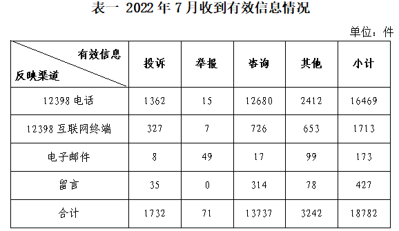 一、基本情況 2022年7月,國家能源局12398能源監管熱線(以下簡稱12398熱線)共收到有效信息18782件(包含投訴、舉報、咨詢和其他訴求類別),環比增加27.09%,同比增加46.48%。(2022年7月收到有效信息情況見表一)