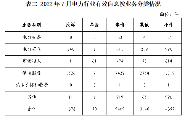 按訴求性質分類,投訴1732件,占有效信息的9.22%;舉報71件,占有效信息的0.38%;咨詢13737件,占有效信息的73.14%;表揚、求助、建議等其他方面3242件,占有效信息的17.26%。 按反映渠道分類,12398電話16469件,12398互聯網終端1713件,電子郵件173件,留言427件。 二、分類情況 2022年7月收到的有效信息中: 電力行業排在首位,有效信息數量為14357件,占全部有效信息的76.44%。群眾關注的內容主要集中在供電服務、電力安全、市場準入等方面。(2022年7月電力行業有效信息按業務分類情況見表二)