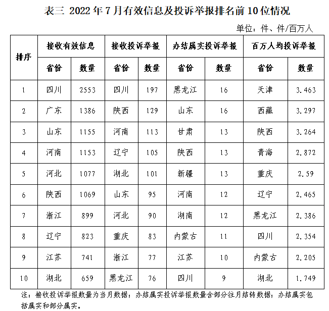 石油天然氣行業排在第二位,有效信息數量為2376件,占全部有效信息的12.65%。群眾關注的內容主要集中在咨詢居民燃氣安裝及收費、燃氣故障問題等方面。 新能源和可再生能源行業排在第三位,有效信息數量為883件,占全部有效信息的4.70%。群眾關注的內容主要集中在分布式光伏發電項目并網、電費結算、補貼發放等方面。 煤炭行業有效信息數量為41件,占全部有效信息的0.22%,主要問題集中在煤炭行業政策、煤炭價格、煤礦項目信息等方面。 其他有效信息合計1125件,占全部有效信息的5.99%。 三、分布情況 各省(自治區、直轄市)按照接收的有效信息數量排序,四川、廣東、山東、河南、河北、陜西、浙江、遼寧、江蘇、湖北排在全國前10位;按照接收的投訴舉報數量排序,四川、陜西、河南、遼寧、湖北、山東、河北、重慶、浙江、黑龍江排在全國前10位;按照辦結屬實的投訴舉報數量排序,黑龍江、山東、甘肅、陜西、新疆、河南、湖南、內蒙古、江蘇、四川排在全國前10位;按照百萬人均投訴舉報數量排序,天津、西藏、陜西、青海、重慶、遼寧、黑龍江、四川、內蒙古、湖北排在全國前10位。(2022年7月有效信息及投訴舉報排名前10位情況見表三)
